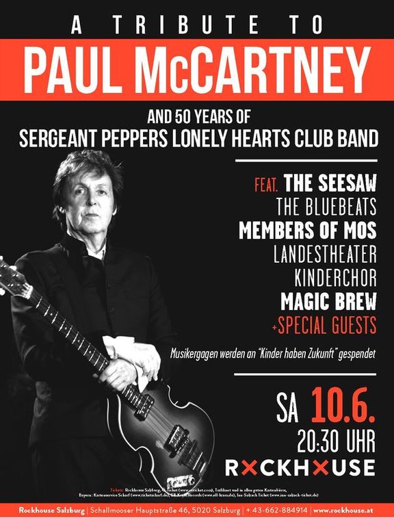 Sir Paul McCartney feierte im Juni seinen 75. Geburtstag, Grund genug für ein großes Tribute-Konzert. Mit dabei waren die Salzburger Bands The See Saw, Magic Brew, members of MOS, The Blue Beats und weitere Special Guests. Auch der Landestheater-Kinderchor hat 3 Nummern beigesteuert. Es war ein toller und abwechslungsreicher Musikabend und die Musiker haben auf Ihre Gagen verzichtet und unserem Verein "Kinder haben Zukunft" € 2.300,-- gespendet. Herzlichen Dank!