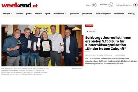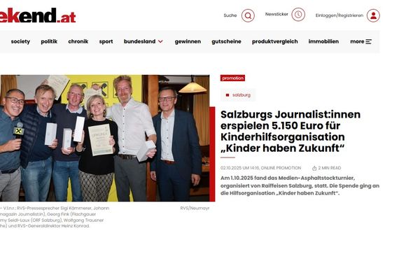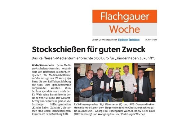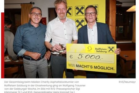 Gestern Abend (1.10.2025) fand das Medien-Asphaltstockturnier, organisiert von Raiffeisen Salzburg, statt. 20 Journalist:innen erspielten auf der Anlage des EV Wals 3.250 Euro, die von Raiffeisen Salzburg auf 5.000 Euro Spendensumme aufgerundet wurde. Zum Schluss spendete auch noch der EV Wals seine Bahnmiete in der Höhe von 150 Euro, womit ein Gesamtbetrag von 5.150 Euro überwiesen werden kann. Empfänger der Spende ist die Salzburger Hilfsorganisation „Kinder haben Zukunft“.