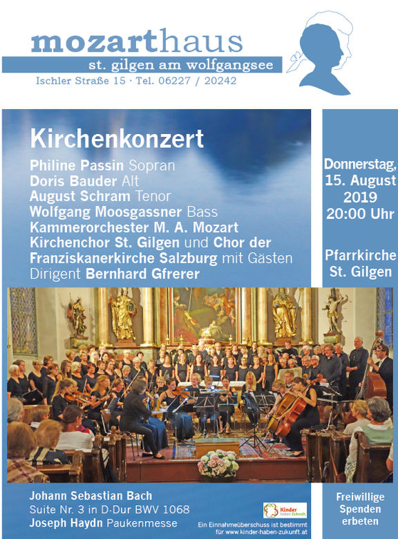 Gemeinsam haben das Kammerorchester Wolfgang Amadeus Mozart, der Kirchenchor St. Gilgen und der Chor der Franziskanerkirche Salzburg mit Gästen, sowie die Solisten Philine Passin, Doris Bauder, August Schram und Wolfgang Moosgassner unter der Leitung des Dirigenten Bernhard Gfrerer Werke von Bach und Hayden präsentiert.